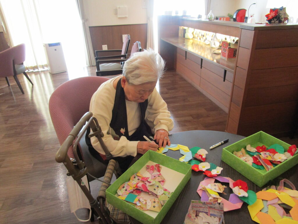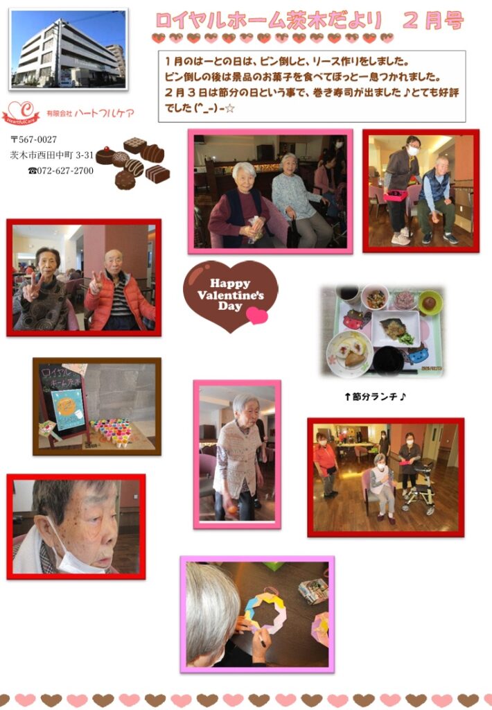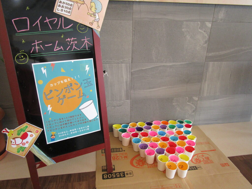 ロイヤルホーム茨木では、1月のはーとの日は、リースを作ったりピンポン玉入れをしたりして、身体を動かしてもらいました。