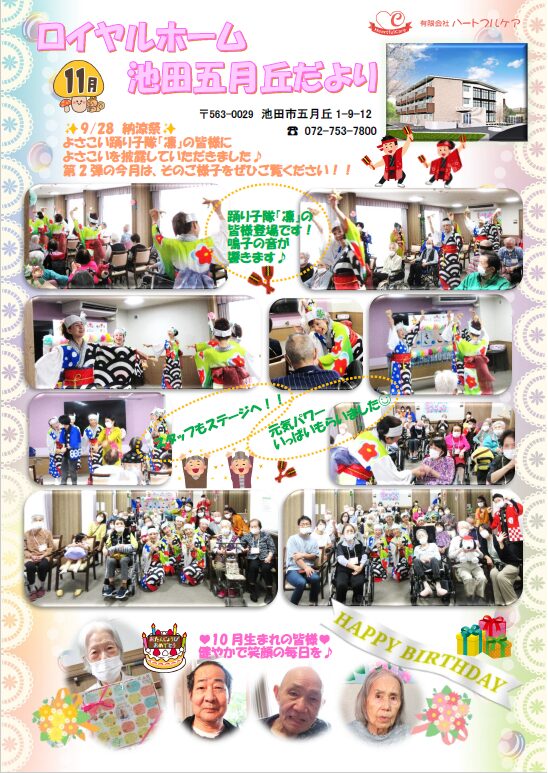 写真中央のとびきり笑顔の『凛』のチームリーダー・コロちゃんは、ロイヤルホーム池田五月丘の介護スタッフです!
